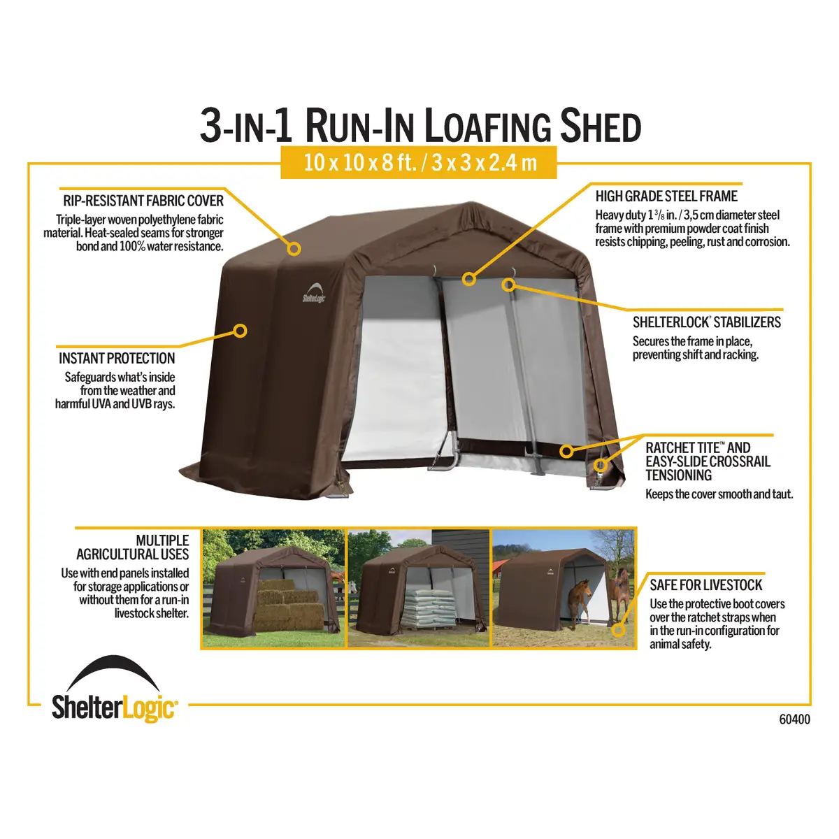 The 10′ x 10′ x 8′ Run-In 3-in-1 Loafing Shed is a versatile outdoor shelter designed to provide reliable protection for horses, livestock, and farm equipment. This structure combines the functionality of a run-in shed, storage shelter, and livestock shade structure in a single durable design. Built with heavy-duty steel framing and weather-resistant panels, it offers a practical solution for farms, ranches, and rural properties.