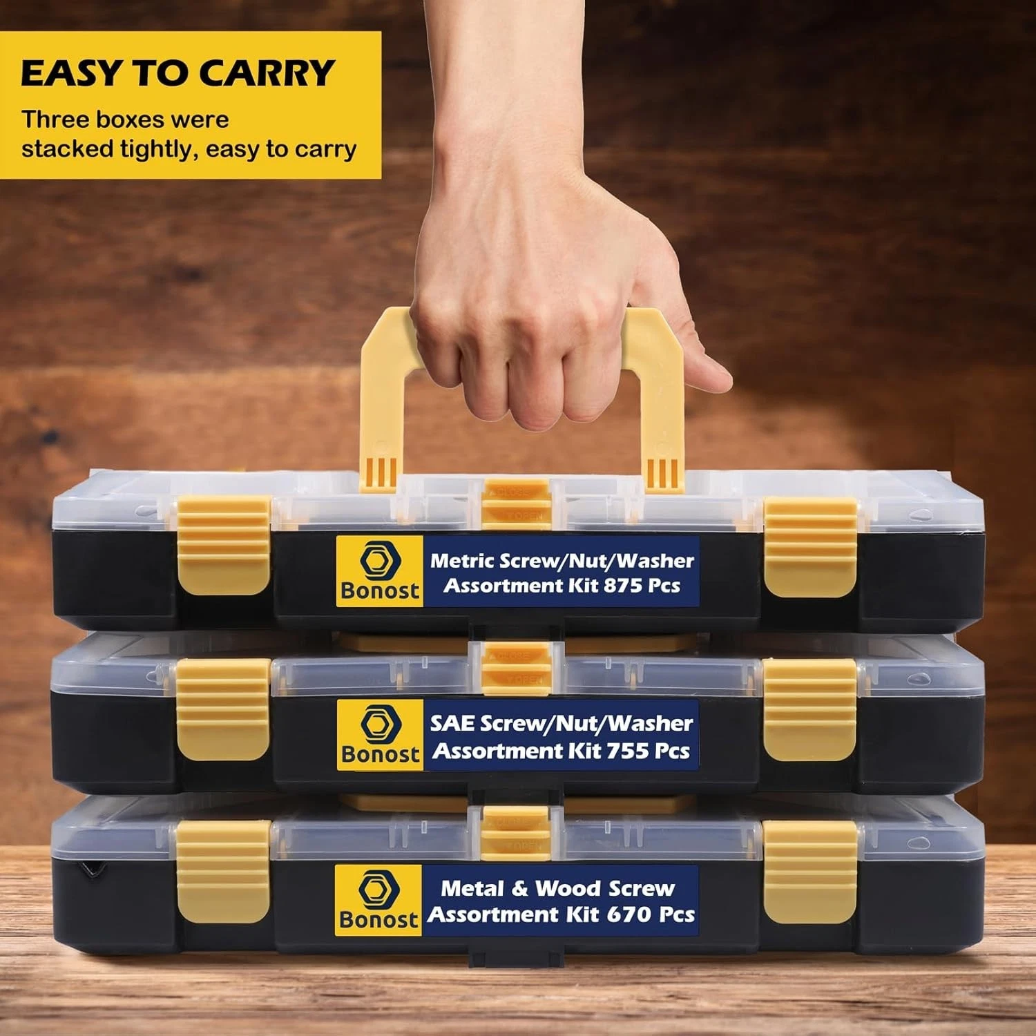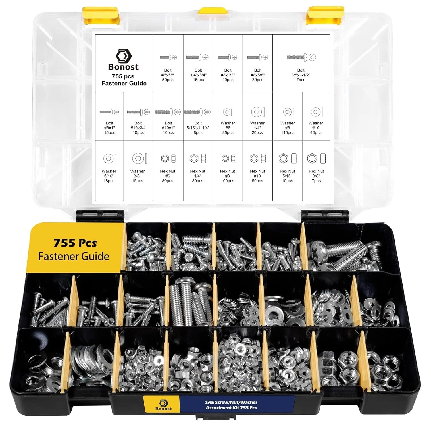 This hardware assortment contains both metric and SAE (inch-based) fasteners, making it suitable for repairing equipment, assembling furniture, maintaining tools, and completing household or workshop projects. By including a large variety of sizes and types, the kit allows users to quickly find the right fastener without needing to purchase separate hardware pieces.
