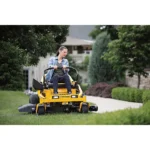 The mower’s powerful engine and wide deck allow users to mow large areas quickly and efficiently.