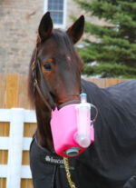 The adult version features a pink soft-shell mask designed to fit the muzzle of standard adult horses comfortably while creating a secure seal for optimal medication delivery.