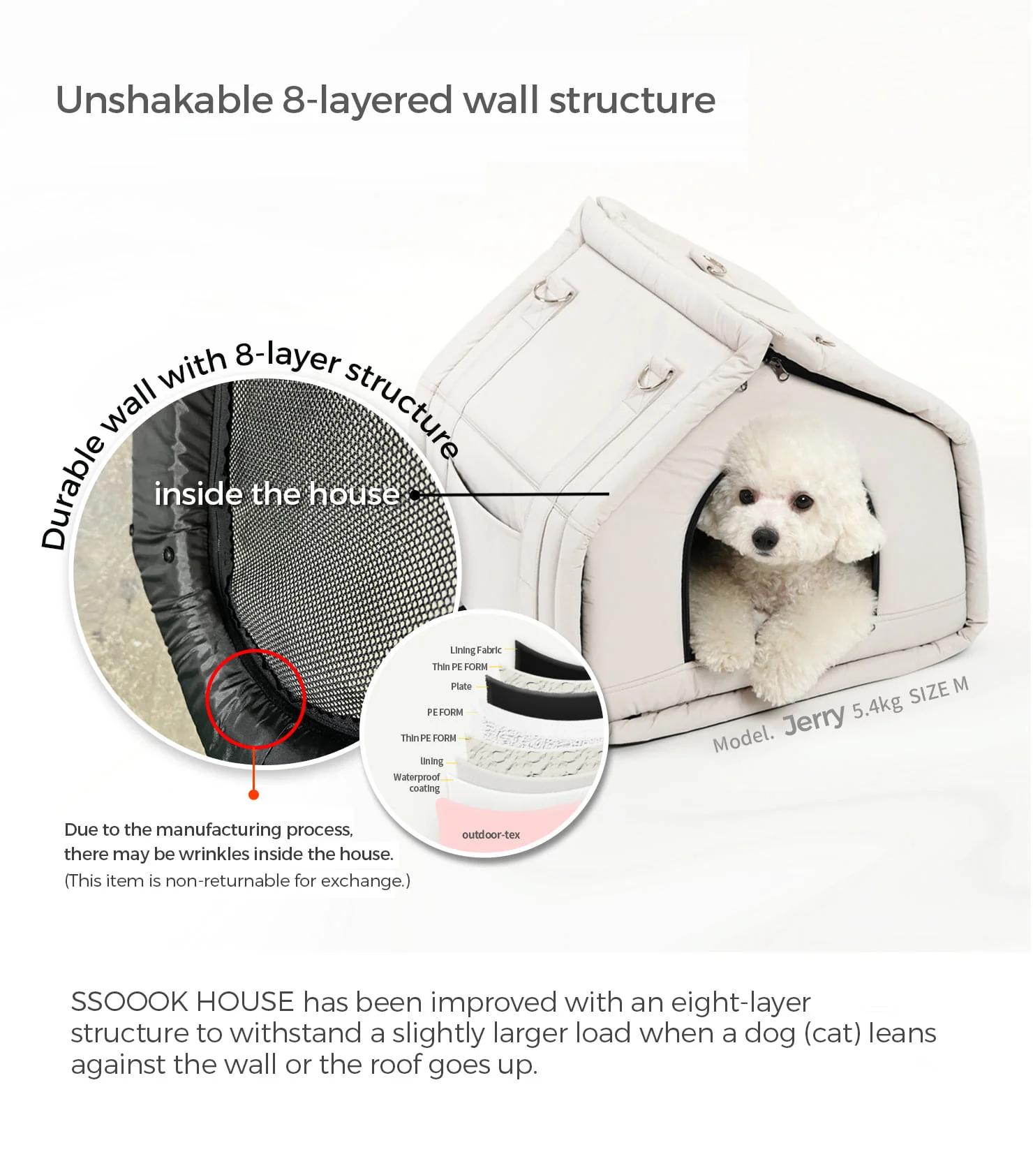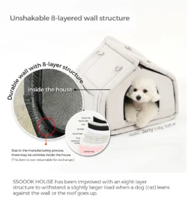 The SSOOOK HOUSE V.3 Set (Model SO-HS001) is a premium indoor pet house designed to provide dogs with a comfortable, secure, and quiet resting environment. Created with a focus on pet comfort and stress reduction, this house functions as a cozy sanctuary where dogs can relax, sleep, and feel protected from external disturbances.